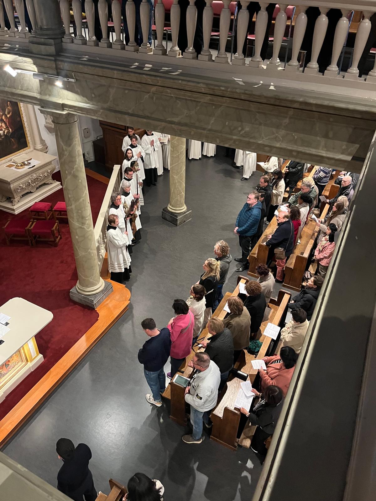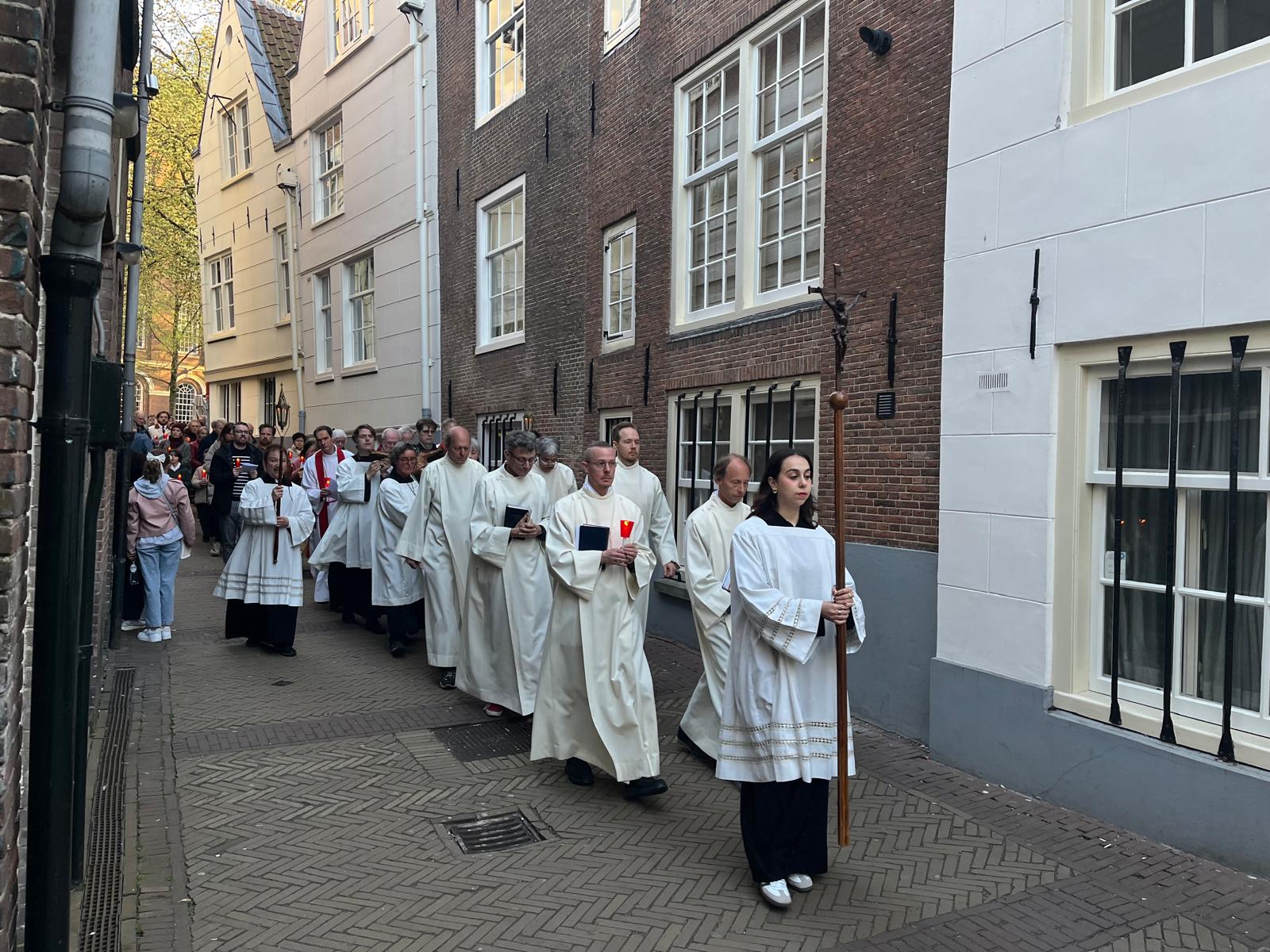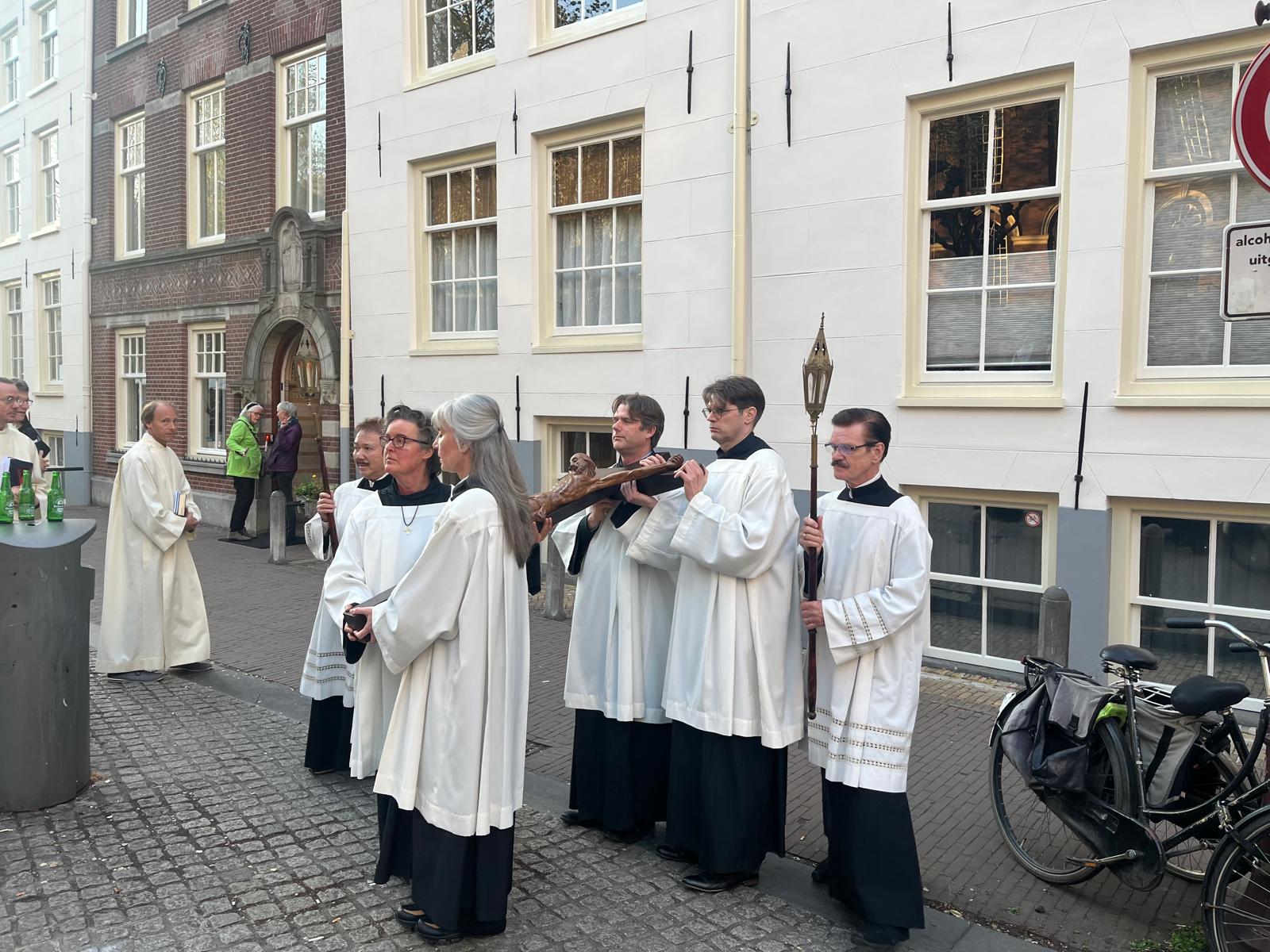 Acolieten, lectoren en vrijwilligers uit beide kerken zorgden voor een vlekkeloos verloop, terwijl de Schola van de Krijtberg en de organist van de Begijnhofkapel de viering muzikaal ondersteunden. De Living Stones die naast de Krijtberg wonen en daar actief zijn als kerkgidsen, begeleidden de stoet en boden praktische ondersteuning.